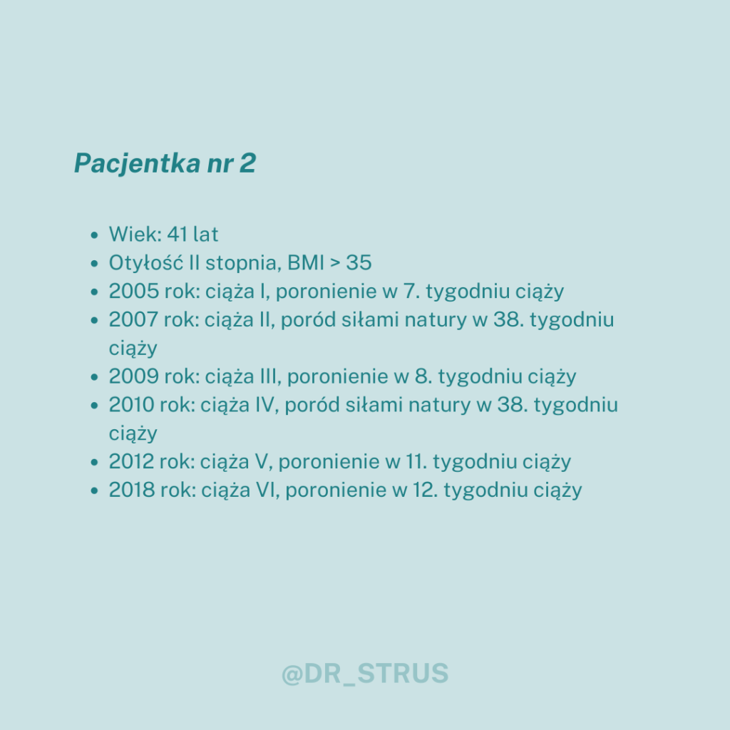 Z panią A. spotkałem się po raz pierwszy w moim gabinecie pod koniec lutego 2020 roku. Przed naszym spotkaniem, pacjentka w przeszłości 6-krotnie była w ciąży, jednak tylko dwie z sześciu ciąż zakończyły się dla pacjentki pomyślnie. W 2007 oraz 2010 roku pacjentka urodziła siłami natury zdrowe dziewczynki, a sam przebieg ciąż był niepowikłany. Każde z czterech poronień wydarzyło się na wczesnym etapie ciąży, do 12 tygodnia. Według relacji pacjentki rozpoczynały się one za każdym razem bardzo podobnie od krwawienia/plamienia z dróg rodnych oraz dolegliwości bólowych brzucha. Po każdym z poronień został wykonany zabieg łyżeczkowania.