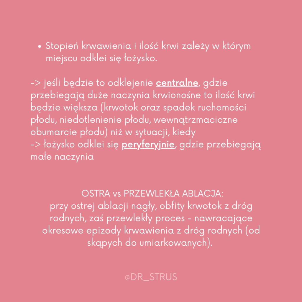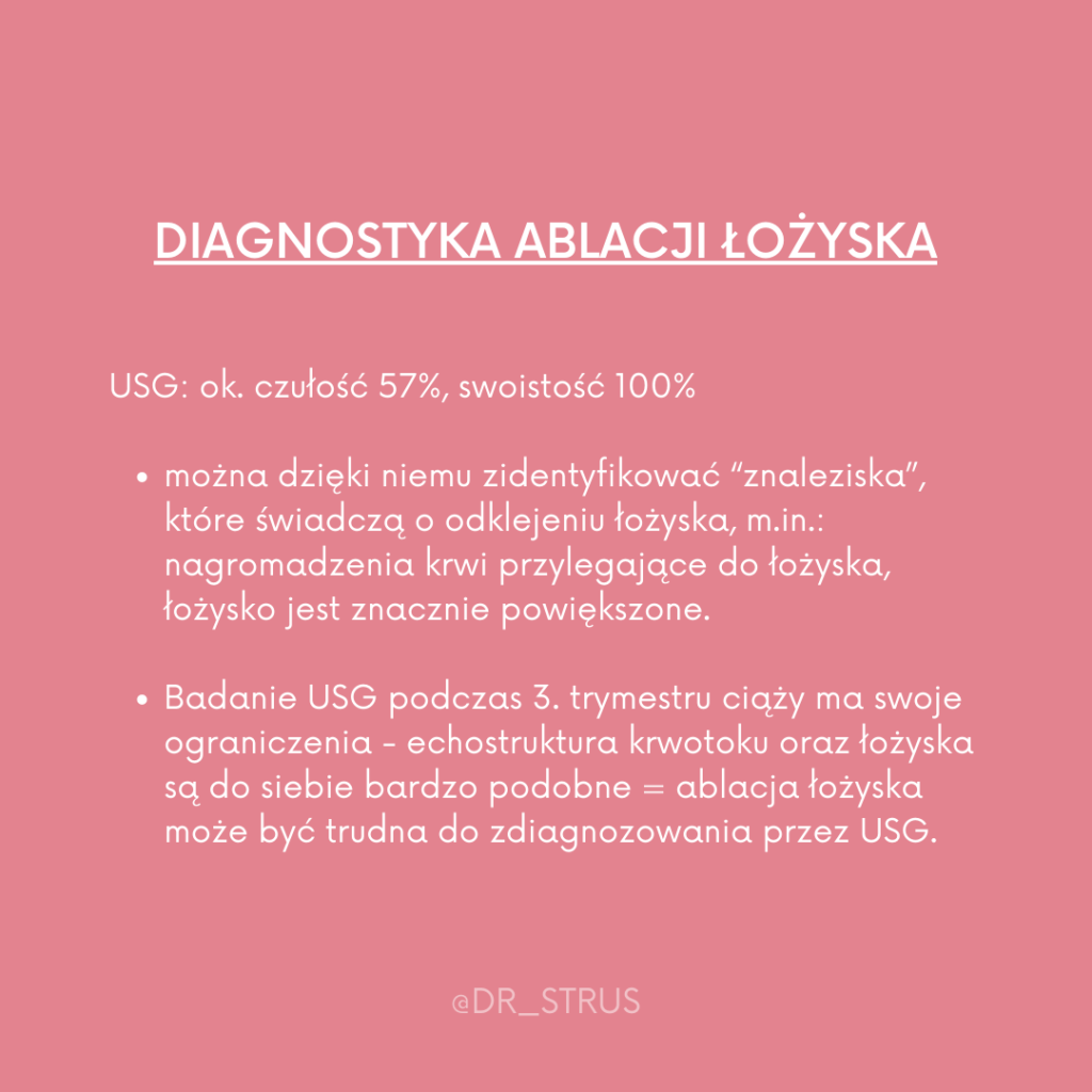 - można dzięki niemu zidentyfikować “znaleziska”, które świadczą o odklejeniu łożyska, m.in. nagromadzenia krwi przylegające do łożyska, łożysko jest znacznie powiększone. W związku z tym, że badanie USG podczas 3. trymestru ciąży ma swoje ograniczenia – echostruktura krwotoku oraz łożyska są do siebie bardzo podobne, to ablacja łożyska może być trudna do zdiagnozowania przez USG.