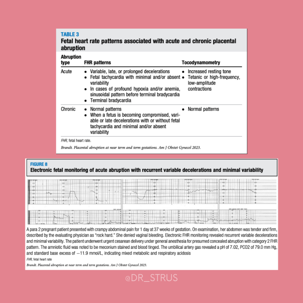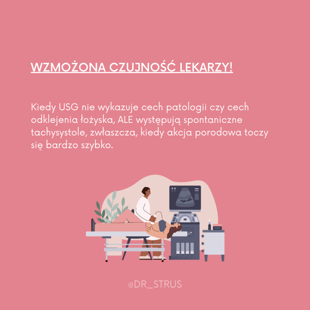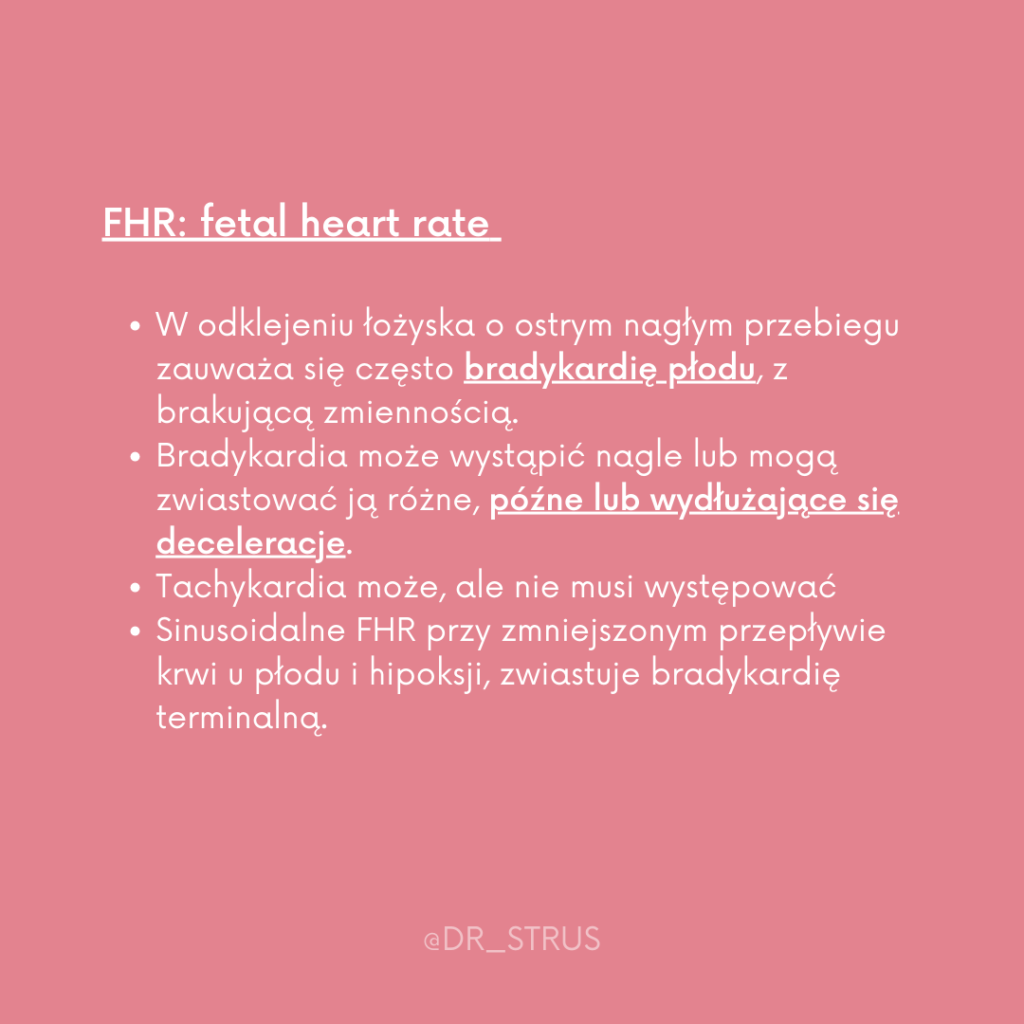 Odklejenie łożyska może przebiegać z bólem brzucha czy w okolicy lędźwiowej i skurczami macicy, ale bez krwawienia z dróg rodnych ciężarnej! Wzmożoną czujność lekarzy powinna budzić sytuacja, kiedy USG nie wykazuje cech patologii łożyska, ale występują spontaniczne tachysystole, zwłaszcza, kiedy akcja porodowa toczy się bardzo szybko. W odklejeniu łożyska o ostrym przebiegu zauważa się często bradykardię płodu, z brakującą zmiennością. Bradykardia może wystąpić nagle lub mogą zwiastować ją różne, późne lub wydłużające się deceleracje.