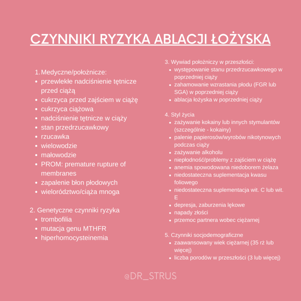 Do przedwczesnego odklejenia łożyska może dojść zarówno w wyniku urazu, ale także spontanicznie. Jak możecie zobaczyć, czynników ryzyka ablacji łożyska jest bardzo dużo, m.in. medyczne/położnicze, genetyczne, wynikające ze stylu życia ciężarnej, czy czynników socjodemograficznych. Podejrzewa się, że na odklejenie łożyska składa się kilka nakładających się na siebie wyżej wymienionych czynników patofizjologicznych.