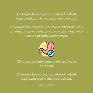 Chirurgia bariatryczna jest ważną opcją leczenia osób z ciężką otyłością. Na całym świecie wzrasta liczba wykonywanych operacji, nawet u kobiet w wieku rozrodczym, ponieważ normalizacja masy ciała jest kluczowa w procesie poprawy płodności. Trwała utrata masy ciała spowodowana chirurgią bariatryczną ostatecznie poprawia m.in. częstość owulacji.