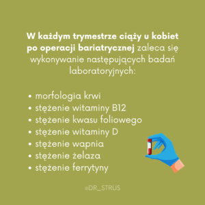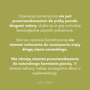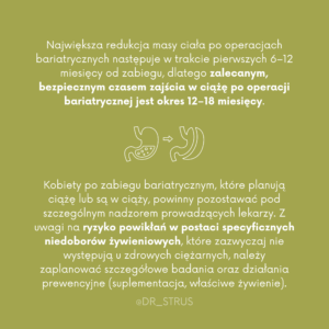 ▫️ Wytyczne praktyki klinicznej Amerykańskiego Stowarzyszenia Endokrynologów Klinicznych oraz Amerykańskiego Towarzystwa Chirurgii Metabolicznej i Bariatrycznej, zalecają unikanie zapłodnienia przez 12 – 18 miesięcy po operacji bariatrycznej.