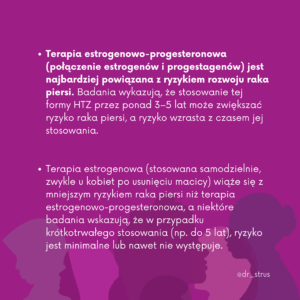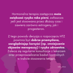Hormonalna terapia zastępcza może zwiększać ryzyko raka piersi, zwłaszcza jeśli jest stosowana przez dłuższy czas i zawiera zarówno estrogeny, jak i progesteron. Z tego powodu decyzja o rozpoczęciu HTZ powinna być dobrze przemyślana, uwzględniając korzyści (np. zmniejszenie objawów menopauzy) i ryzyko zdrowotne. Zaleca się regularne konsultacje z lekarzem oraz przeprowadzanie badań kontrolnych w trakcie stosowania terapii.