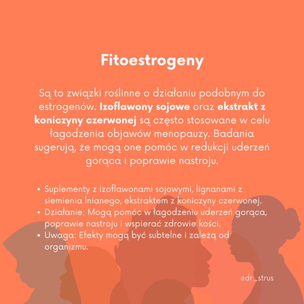 Fitoestrogeny: Są to związki roślinne o działaniu podobnym do estrogenów. Izoflawony sojowe oraz ekstrakt z koniczyny czerwonej są często stosowane w celu łagodzenia objawów menopauzy. Badania sugerują, że mogą one pomóc w redukcji uderzeń gorąca i poprawie nastroju.