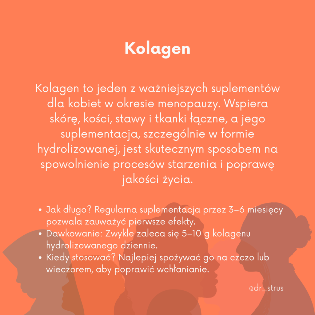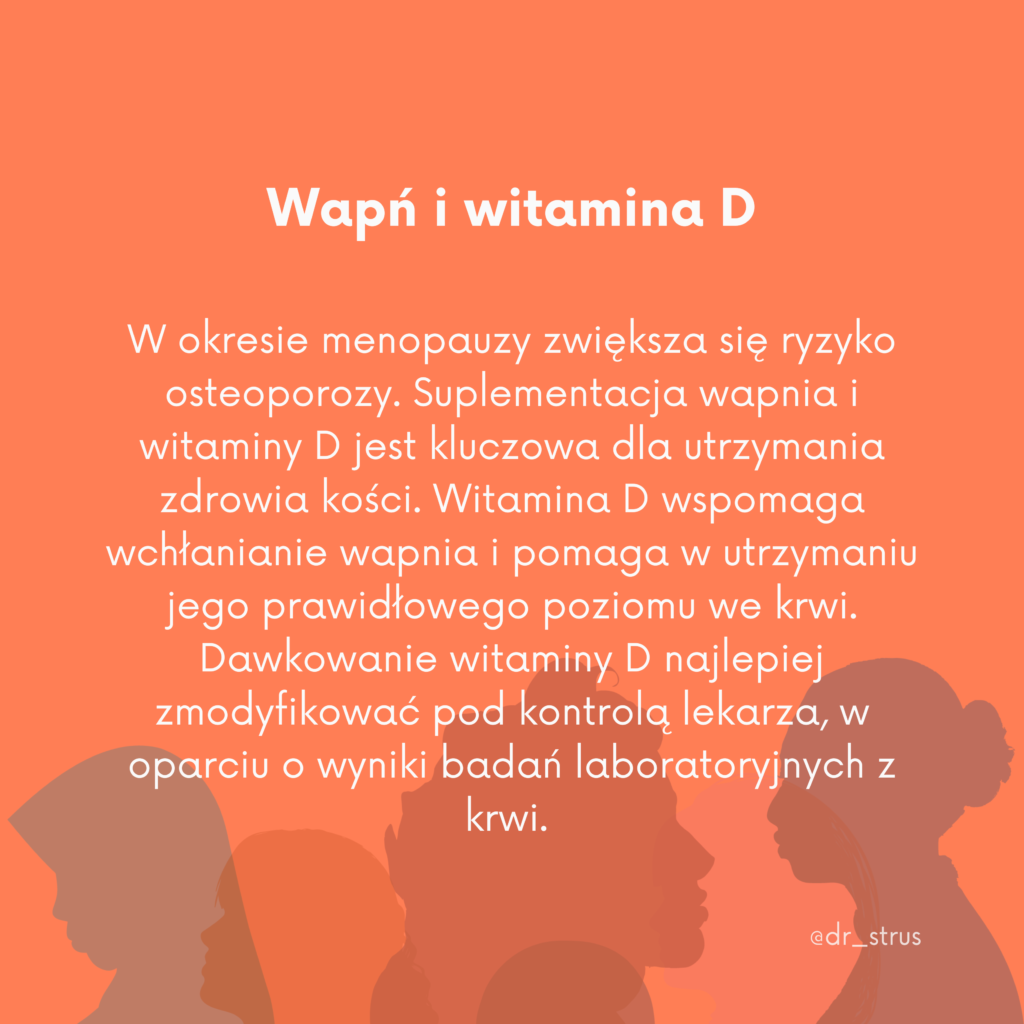 Wapń i witamina D: W okresie menopauzy zwiększa się ryzyko osteoporozy. Suplementacja wapnia i witaminy D jest kluczowa dla utrzymania zdrowia kości. Witamina D wspomaga wchłanianie wapnia i pomaga w utrzymaniu jego prawidłowego poziomu we krwi. Dawkowanie witaminy D najlepiej zmodyfikować pod kontrolą lekarza, w oparciu o wyniki badań laboratoryjnych z krwi.