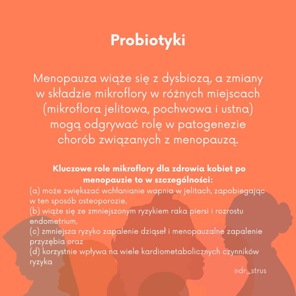 Probiotyki: Menopauza wiąże się z dysbiozą, a zmiany w składzie mikroflory w różnych miejscach (mikroflora jelitowa, pochwowa i ustna) mogą odgrywać rolę w patogenezie chorób związanych z menopauzą (tj. osteoporozy, raka piersi, rozrostu endometrium, zapalenia przyzębia i choroby kardiometaboliczne). Kluczowe role mikroflory dla zdrowia kobiet po menopauzie to w szczególności: (a) może zwiększać wchłanianie wapnia w jelitach, zapobiegając w ten sposób osteoporozie, (b) wiąże się ze zmniejszonym ryzykiem raka piersi i rozrostu endometrium, (c) zmniejsza ryzyko zapalenie dziąseł i menopauzalne zapalenie przyzębia oraz (d) korzystnie wpływa na wiele kardiometabolicznych czynników ryzyka (tj. otyłość, zapalenie oraz metabolizm glukozy i lipidów we krwi). Dalszego wyjaśnienia wymaga jednak to, czy doustna suplementacja probiotykami może być stosowana w leczeniu dysbiozy związanej z menopauzą.