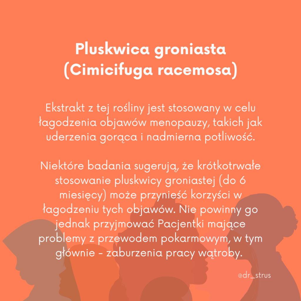 Pluskwica groniasta (Cimicifuga racemosa): Ekstrakt z tej rośliny jest stosowany w celu łagodzenia objawów menopauzy, takich jak uderzenia gorąca i nadmierna potliwość. Niektóre badania sugerują, że krótkotrwałe stosowanie pluskwicy groniastej (do 6 miesięcy) może przynieść korzyści w łagodzeniu tych objawów. Nie powinny go jednak przyjmować Pacjentki mające problemy z przewodem pokarmowym, w tym głównie – zaburzenia pracy wątroby.