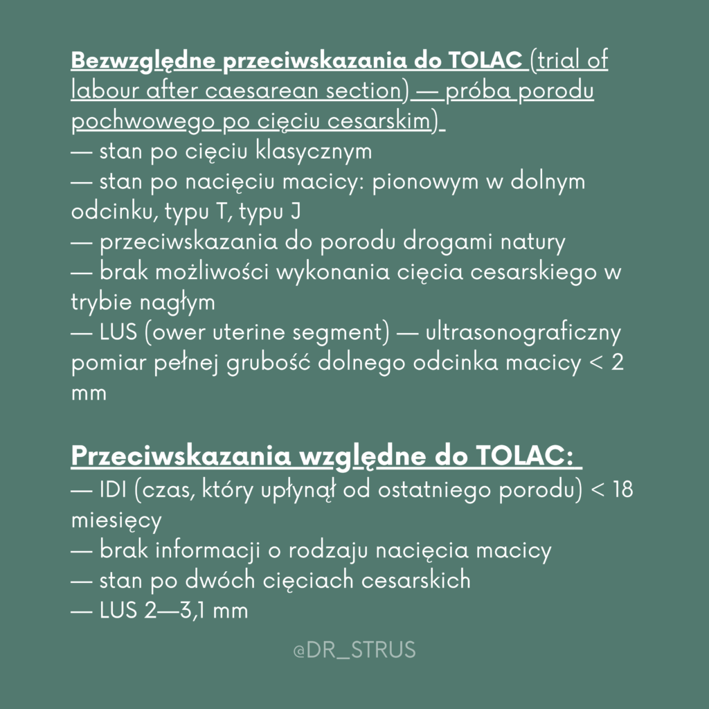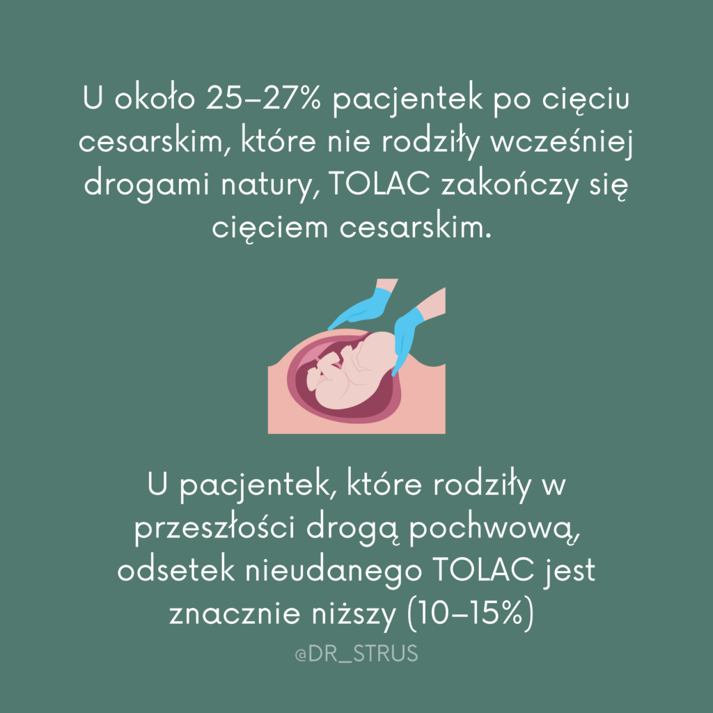 Próba porodu po cięciu cesarskim (TOLAC) odnosi się do planowanej próby porodu drogą pochwową przez kobietę, która miała już za sobą cesarskie cięcie, niezależnie od wyniku. Metoda ta zapewnia kobietom pragnącym porodu drogą pochwową możliwość osiągnięcia tego celu – porodu drogą pochwową po porodzie cesarskim (VBAC). Oprócz spełnienia preferencji pacjentki w zakresie porodu drogami natury, VBAC wiąże się na poziomie indywidualnym ze zmniejszoną zachorowalnością matek i zmniejszonym ryzykiem powikłań w przyszłych ciążach, a także zmniejszeniem ogólnego wskaźnika porodów poprzez cesarskie cięcie na poziomie populacji. Jednakże, chociaż TOLAC jest odpowiedni dla wielu kobiet, kilka czynników zwiększa prawdopodobieństwo niepowodzenia porodu, co z kolei wiąże się ze zwiększoną zachorowalnością matek i okołoporodowego w porównaniu z udaną próbą porodu (tj. VBAC) i planowym powtórnym cesarskim cięciem. Dlatego przy ustalaniu, kto jest odpowiednim kandydatem do TOLAC, ważna jest ocena prawdopodobieństwa wystąpienia VBAC, a także indywidualnego ryzyka.