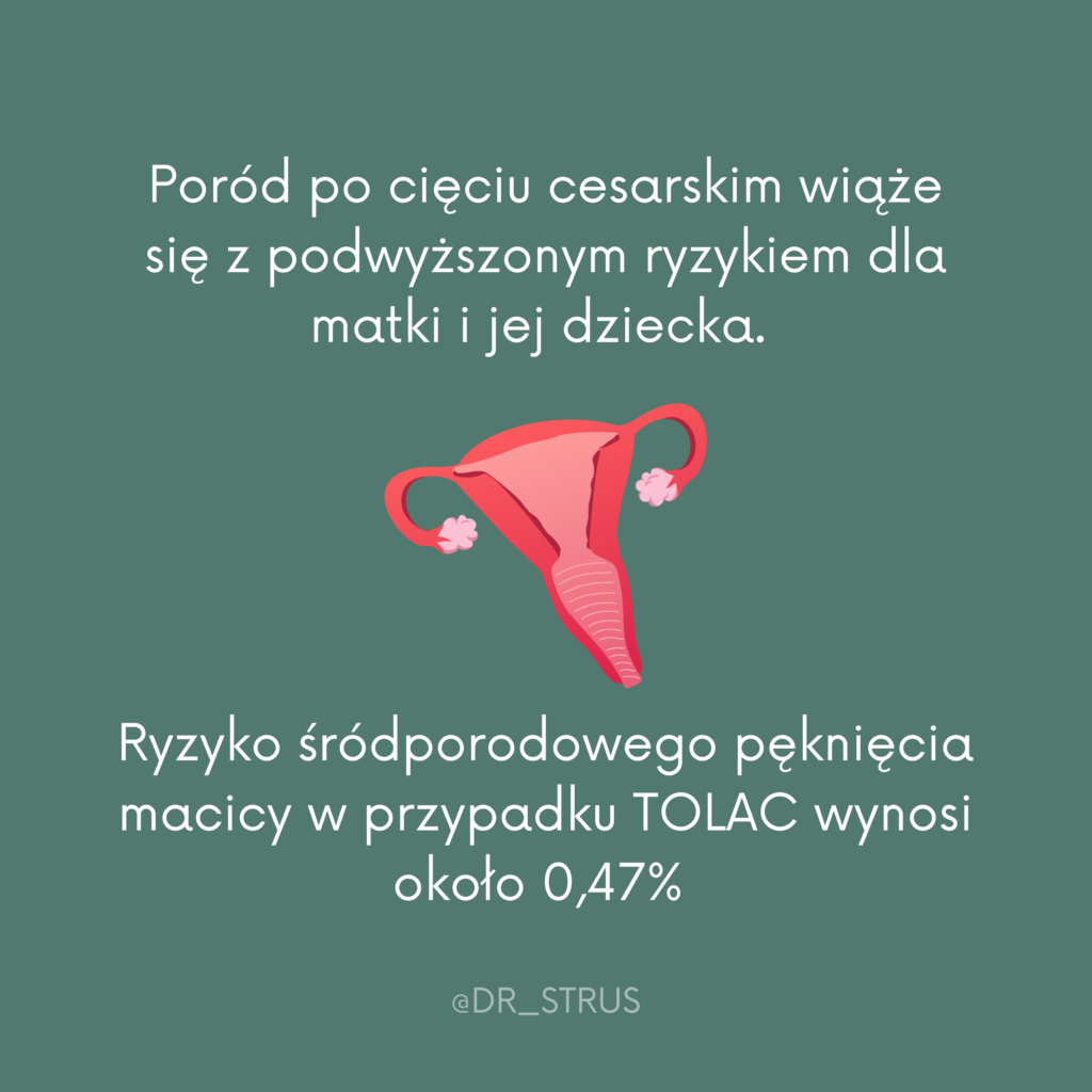 - Ryzyko pęknięcia macicy – jest to jedno z najpoważniejszych powikłań, ale jego częstość szacuje się na około 0,5–1%.