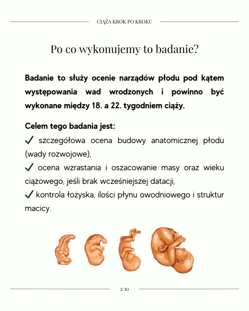 Badanie to wykonuje się najczęściej między 18. a 22. tygodniem ciąży, kiedy narządy dziecka są już wystarczająco rozwinięte, aby można było je dokładnie ocenić w badaniu ultrasonograficznym.